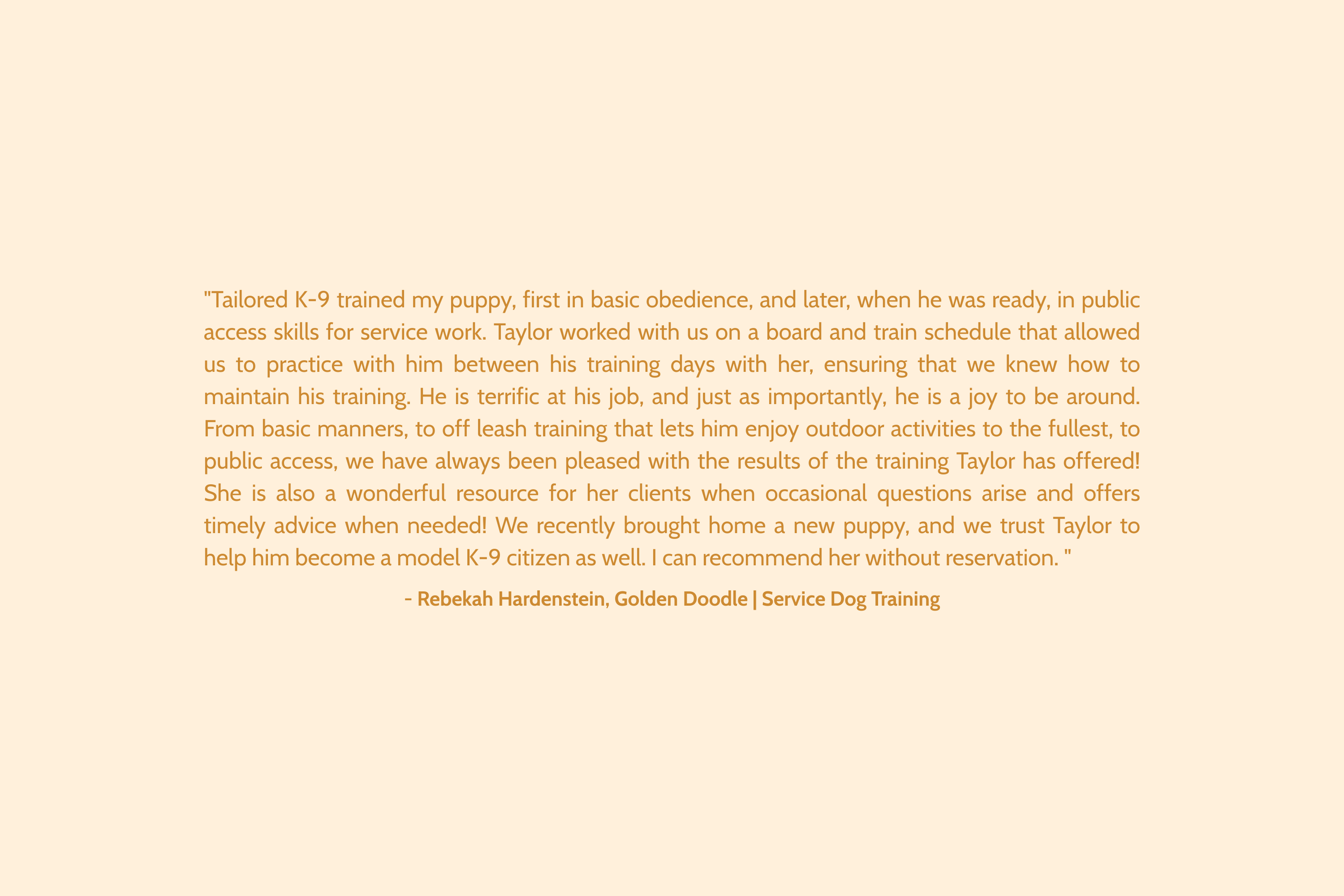 Whether you’re starting with a new puppy, working through leash pulling and behavior challenges, or training a future service dog, we’re here to help! Schedule training with Taylor today.